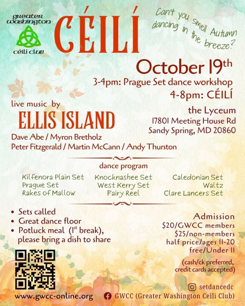 Ceilis are social dance events featuring traditional Irish music and dances. All are welcome–even if you don’t dance, come and enjoy the live music from great local bands.